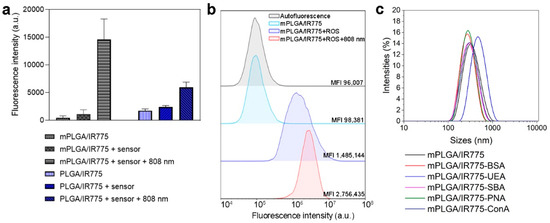 Characterization of mPLGA/IR775 nanoparticles as nanoagents for PDT. (a) ROS generation study of nanoparticles under the irradiation with an 808 nm laser: magnetic mPLGA/IR775 and non-magnetic PLGA/IR775 nanoparticles were incubated with ROS sensor and irradiated with 808 nm light and centrifuged, and the fluorescence of the supernatant was measured (λex = 500 nm, λem = 525 nm). (b) Flow cytometry study of ROS generation. Cells were incubated with mPLGA/IR775 nanoparticles and ROS sensor and irradiated with 808 nm laser for 10 min. Histograms represent cell populations in the fluorescent channel corresponding to the ROS sensor fluorescence (λex = 488 nm, λem = 525/20 nm). (c) mPLGA/IR775 were conjugated to different lectins as well as to BSA and characterized with the dynamic light scattering method, confirming the colloidal stability of nanoparticles after chemical conjugation.