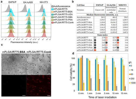 In vitro study of mPLGA/IR775 interaction with cells. (a) Flow cytometry assay on evaluation of the binding efficiency of lectin-modified nano-PLGA. EMT6/P cells were labeled with lectin-conjugated particles and analyzed with flow cytometry in the fluorescence channel corresponding to IR775 fluorescence. (b) Flow cytometry histograms are accompanied by the median fluorescence intensity data and stain index calculation for three cell lines. (c) Fluorescent microscopy of EMT6/P cell labeled with mPLGA/IR775-BSA and mPLGA/IR775-ConA nanoparticles. Scale bars, 50 µm. (d) Resazurin test on the evaluation of mPLGA/IR775-ConA nanoparticle cell toxicity under 808 nm laser light irradiation.