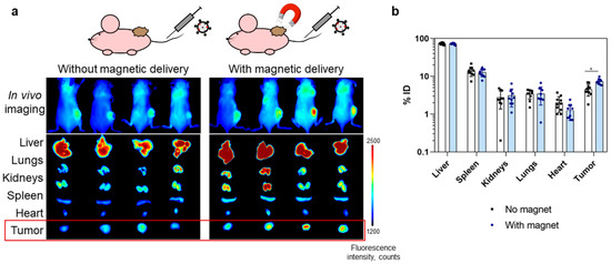 Extracted organs of mice from two groups: with and without magnetic delivery (n = 10 in each group) were measured with the MPQ device in order to obtain particle distribution in organs. The data presented in Figure 5b demonstrate the difference in nanoparticle accumulation in tumors for these groups: 4.5 ± 1.5% vs. 7.3 ± 1.3% of the injected dose for groups without and with the applied magnetic field, respectively. Significant differences between the control group and experimental group determined with two-sided unequal variances t-tests (Welch’s test) for two-group comparisons showed the p-value to be equal to 0.0004, thus proving the difference in nanoparticle accumulation in tumors.