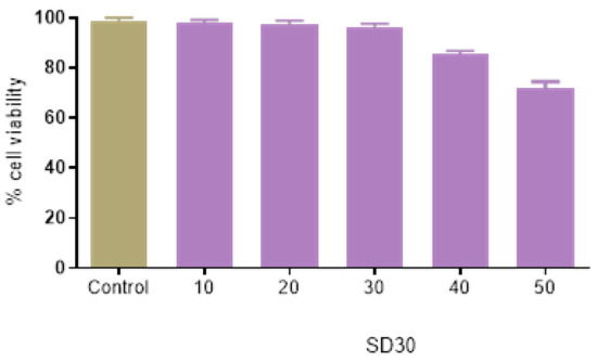 Generally, in vitro cell line studies have been routinely used as these can be helpful in primary optimization and mechanistic investigations before animal-based toxicology studies [23]. The evaluation of the neuroprotection effect of compound SD-30 (10, 20, 40, and 50 mM) on human neuroblastoma SH-SY5Y cell lines was assessed through MTT (3-(4,5-dimethylthiazol-2-yl)-2,5- diphenyl tetrazolium bromide) assay [23,24] (as shown in Figure 2). This cell line is often used in AD due to its human origin and ease of maintenance [25].