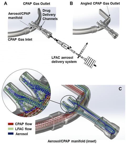 We selected nasal prong interfaces commonly used to deliver CPAP (n = 3), and cannula prototypes (n = 2) specifically designed for DP aerosol delivery. The RAM Cannula (Neotech Products, LLC, Valencia, CA, USA) and Hudson Prongs (Hudson-RCI, Temecula, CA, USA) were adapted to streamline aerosol delivery with bCPAP. The RAM cannula (Figure 2A) and bCPAP patient circuit were connected in series using an elbow adaptor with a perpendicular aerosol injection port placed within 2 cm of the cannula tubing entry point. The Hudson RCI cannula (Figure 2B) was adapted to emit aerosol from the LFAC injector into the CPAP flow via a Luer-lock fitting on the inspiratory manifold to monitor airway pressure. The GINEVRI prong interface (Rome, Italy) was attached in series with a specialized aerosol connector (AFECTAIR®, Windtree Therapeutics Inc., Warrington, PA, USA) with an internal channel designed to separate the fluidic paths of aerosol from CPAP flow at the nasal interface [22]. The LFAC outlet tubing was inserted through the center channel within 2 cm of the prong inlet (see Figure 2C). The Neotech Aerosol Delivery Prong (Prototypes 1 and 2, Neotech Valencia, CA, USA) was designed to incorporate a streamlined aerosol flow channel mostly separated from the CPAP flow (Figure 3A–C). Prototype 2 includes angled tubing at the expiratory outlet (see Figure 3B) to direct more aerosol to the nasal airway opening. Descriptive computational fluid dynamics (CFD) analysis was performed with 3D models of the Neotech Aerosol Delivery Prong using Solidworks (2021 Flow Simulation module) to evaluate in silico particle behavior and interaction with CPAP flow using the prototype prongs. The analysis was based on density, dynamic viscosity, surfactant-specific heat, thermal conductivity density, MMAD of DP B-YL: Trehalose surfactant combined with lung model flows, CPAP flow, and pressure, and LFAC flow output and is described in greater detail in Figure 3C. All nasal interfaces were inserted 2 cm into the openings of the nasal airway model and affixed with a hydrocolloid securement barrier (Cannulaide, Sun Med, Grand Rapids, MI, USA) to provide an occlusive fit and prevent the leakage of aerosol and CPAP.