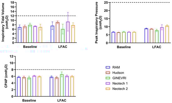 LFAC compatibility during aerosol surfactant delivery with bCPAP and different airway nasal interfaces. All interfaces had an acceptable level of safety on delivered tidal volume, peak inspiratory pressure, and PEEP within the test lung. LFAC: low-flow aerosolization chamber; PEEP: Positive end expiratory pressure. n = 20 breaths/group. Values are means ± SD. The dotted lines represents the maximum acceptable pressure and volume limits commonly associated with increased risk for pulmonary injury and inflammation in preterm infants.