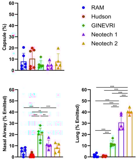 Surfactant aerosol deposition in the nasal airway and lung model with LFAC and bCPAP with passive humidification. Main-stream interfaces (RAM and Hudson) showed low aerosol delivery deposition to nasal airway and lung, while side-stream interfaces (Ginevri and 2 types of Neotech) showed greater aerosol delivery deposition to nasal airway and lung, especially for lung delivery with both Neotech prongs. n = 6/group. Values are means ± SD. **, p < 0.01; ***, p < 0.001. Values were compared using one-way ANOVA with post-hoc Tukey multiple comparison. Capsule: residual powder in capsule after procedure. Nasal Airway: aerosol deposition in the nasal passages, pharynx, larynx, and tracheal adaptor. Lung: aerosol deposition captured within the filter at the distal trachea region.
