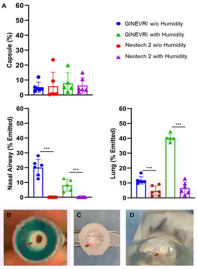 A 30 mg capsule of DP B-YL: Trehalose surfactant was punctured and placed into the LFAC chamber. Aerosol was generated with bellows deflation timed to coincide with the inflation of the lung model chest-rise analog (n = 50 actuations/run). Each of the CPAP interfaces (n = 5) was tested over six runs (n = 6) for a total of 30 measurements for the passive humidification condition. The difference in the DP capsules’ gravimetric mass (µg) between pre- and post-nebulization and following the cleaning of the capsule was used to determine the nominal, residual, and emitted DP surfactant dose from the LFAC nebulizer. Following aerosol delivery, the nasal airway and lung model filters were reweighed and the changes in mass delivered at each location represented the depositional loss to the upper airway and estimated inhaled lung dose, respectively. Each was referenced to the total emitted dose of the LFAC for each run. Depositional losses to the LFAC, interfaces, and bCPAP system could not be measured directly and were estimated based on the mass balance differences between the capsule loading and residual doses and cumulative mass deposited in the nasal and lung model. All devices were cleaned with sterile water and dried in a vacuum following nebulization.
