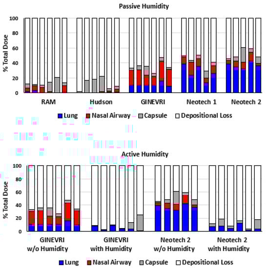 In the passive humidity condition, the Ginevri (Afectair) interface resulted in greater nasal deposition than any of the other interfaces (p < 0.001) and a higher delivered lung dose than the RAM or Hudson interfaces (p < 0.001) (Figure 5 and Figure 7). The RAM and Hudson interfaces had greater nasal airway than lung filter deposition and less aerosol delivery to the nasal airway and lung than the other nasal interfaces. The Neotech interfaces showed lower nasal deposition than the Ginevri interface with 30% and 40% lung filter delivery with Neotech prototypes (Version 1) and (Version 2), respectively (Figure 6 and Figure 7).