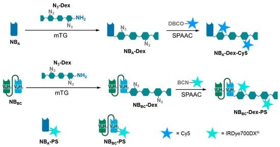 In this study, we chose to examine whether the previously described concept of dextramabs could be applied to nanobodies. Therefore, nanobody–dextran conjugates (dextraknobs) were generated and decorated with a cargo of desire. Anti-EGFR NBs NBA [] and the biparatopic 7D12-9G8 [] (in the following denoted as NBBC) were engineered to allow enzyme-mediated conjugation with dextran scaffolds of different molecular weight at the C-terminus (Figure 1). After conjugation, the cargo of desire was introduced via strain-promoted azide–alkyne cycloaddition (SPAAC). For imaging studies, to assess the effect of the dextran on the distribution capacity, we introduced a Cy5 label to the dextraknobs and examined the penetration behavior in 3D tumor spheroids. To assess the potency of this approach in therapeutic applications, we chose the photosensitizer (PS) IRDye700DX® as pro-drug. PSs are a class of pro-drugs that, upon irradiation with light of a certain wavelength, generate reactive oxygen species, causing severe damage to cells, and leading to cell death through different mechanisms []. Due to the local light activation, they feature a comparably low to no “dark toxicity” in the absence of light. We have shown the great potency and cytotoxic specificity of nanobody–photosensitizer conjugates [,,,], and here we have investigated the same PS in NB-dextran-PS conjugates, through EGFR-targeted photodynamic therapy (PDT) in 2D and 3D studies.