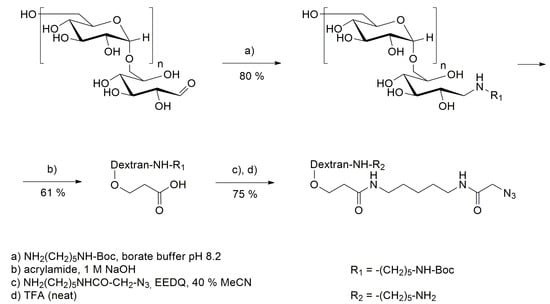 Dextrans of different molecular weights (10,000, 5000 and 1000) were modified to bear approximately two azide moieties per dextran molecule at the glucose repeating units and a free amine at the reducing end introduced via reductive amination as described by Schneider et al. []. Analytical data can be found in the Supplementary Materials (Figures S1–S6).