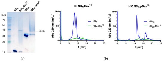 NB-dextran conjugates were generated by mTG-mediated conjugation of N3-Dex-Cad and His-NBA or His-NBBC, respectively (Figure 3a). Excess reactants and mTG were removed via immobilized metal ion chromatography (IMAC). Sodium dodecyl sulfate polyacrylamide gel electrophoresis (SDS-PAGE) and hydrophobic interaction chromatography (HIC) analysis were performed for reaction control. SDS-gels of the conjugates revealed a smear above the band of remaining unmodified NBs, which is attributed to NB-dextran conjugates (Figure 3a and Figure S8A–D,F) []. HIC analysis confirmed a quantitative conversion of the nanobodies (Figure 3b and Figure S8E) as reactant peaks of the unconjugated nanobodies diminish and a broad peak could be observed, which is caused by conjugation with dextran [].