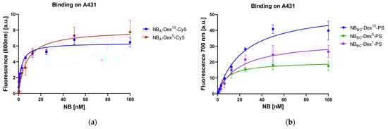The apparent binding affinities (KD) of NBA-Dex10-Cy5 and NBA-Dex5-Cy5 conjugates binding to EGFR on the surface of A431 cells were found to be in the single-digit nanomolar range (Figure 4a) which is in line with published KD values obtained for NBA conjugated to PS []. These results indicate that binding properties were not impaired by the added dextran and Cy5 label.