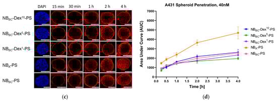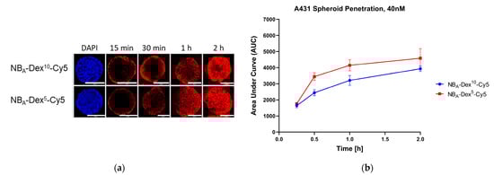 Since nanobodies’ small size is expected to be beneficial for efficient tissue distribution, here the different size NBA-Dex-Cy5 dextraknobs were tested for their penetration in 3D spheroids. For this purpose, a 3D tumor spheroid model of A431 was employed, similar to what was previously described by Beltrán Hernández et al. for Alexa Fluor 647-labeled nanobodies (Figure S11) [].