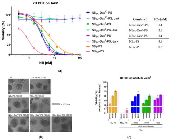 To further explore the potential of dextraknobs for EGFR-targeted nanobody photodynamic therapy, an in vitro assay was performed on a monolayer of A431 and MCF-7 cells as previously described with NBBC-PS conjugates []. First of all, treatment of MCF-7 with dextran conjugates did not affect viability (Figure S13), even if the fluorescence signal observed after pulse (Figure S14) was slightly higher than what was seen in the previous binding assay. When omitting illumination, the dextran conjugates applied on A431 cells also did not affect cell viability and EC50 values could not be determined, verifying the specific activation of the PS by illumination (Figure 6a). Moreover, it can be assumed that there is no cytotoxicity related to the dextran modification of the nanobodies, which was expected for the FDA-approved polysaccharide broadly applied for generation of prodrugs [].