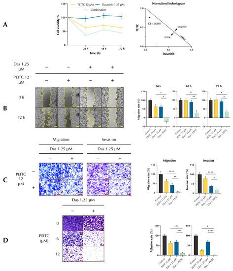 HepG2 cells were treated with either PEITC (12 μM), dasatinib (1.25 μM), or their combination, and cell viability was measured after 24, 48, and 72 h. The results showed a decrease in cell viability in the combination treatment (Figure 1A Left). To assess the relevance of the drug combination, the Chou–Thalalay method was used to calculate the combination index. Values below 1.0 indicates a synergy, whereas values above 1.0 indicates an antagonism effect. The normalised isobologram (Figure 1A Right) showed a value of 0.869, indicating that the drugs synergise when combined. A scratch wound healing assay determined the ability of PDc to inhibit the migration of HepG2. PDc treatment reduced the ability of the cells to migrate to fill the scratched space (Figure 1B). Next, to assess the PDc effect on migration and invasion, HepG2 cells were subjected to the Boyden chamber assay with or without a coating of extra cellular matrix. The results confirmed the findings from the scratch assay, with a reduction in migrated cells towards the lower chamber (Figure 1C). Furthermore, PDc reduced the ability of HepG2 cells to digest the ECM coating, inhibiting the cell invasive capacity (Figure 1C). Finally, to determine whether PDc can reduce the ability of cancerous cells to adhere to a new ECM, an adhesion assay was employed. After three hours, cell adhesion was strongly impaired by combination treatment, either using PEITC 6 μM or PEITC 12 μM (Figure 1D).
