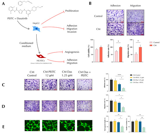 Effect of PDc on tumour-induced angiogenesis in vitro. (A) Diagram of HepG2-conditioned medium (CM) model. (B) Effect of HepG2-conditioned medium on HUVECs adhesion and migration, representative images (10×, scale bar 20 µm) on the top; quantification of cell viability, adhesion, and migration rate with ImageJ 1.55k on the bottom. Effect of PDc HepG2-conditioned medium on HUVECs: (C) adhesion, representative images (10×, scale bar 20 µm) on the left, quantification of adhesion rate using ImageJ 1.55k on the right (mean ± SEM, n = 4); (D) migration, representative images (10×, scale bar 20 µm) on the left, quantification of migration rate with ImageJ (mean ± SEM, n = 4); (E) in vitro angiogenesis representative images (4×, scale bar 200 µm) on the left; quantification of segment length and number of meshes with ImageJ on the right (mean ± SEM, n = 4). The degrees of significance are indicated as * p < 0.05, ** p < 0.01, **** p < 0.0001 calculated with one-way ANOVA and Tukey’s post hoc multiple comparison.