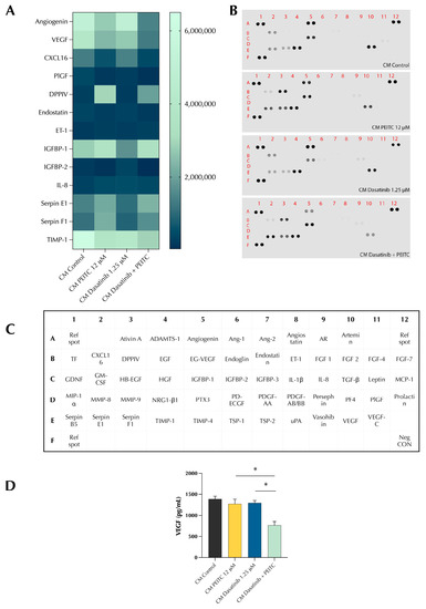 Effect of PDc on HepG2-conditioned medium. (A) Heat map of angiogenesis proteome profiler. (B) Blots of Angiogenesis Proteome Profiler. (C) Legend of targets location on blot. (D) VEGF quantification of conditioned medium via ELISA. The degrees of significance are indicated as * p < 0.05, calculated with one-way ANOVA and Tukey’s post hoc multiple comparison.