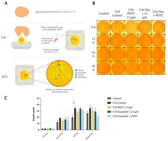 The effect of PDc on tumour-induced angiogenesis was evaluated in vivo using a chick yolk membrane (YSM) ex ovo assay. The yolk sac membrane is highly vascularised to allow the delivery of nutrients to the developing chick. Thus, the application of a solution can give insight into the ability of that solution to promote or inhibit angiogenesis. CM (2.5 mg/mL) was applied to the yolk sac membrane with a plastic ring and then pictures were taken every 12 h for 36 h, when the vessels develop to a complexity that allow the observation of quaternary vessels; these are the smallest vessels that originated from the branches, which, in turn, arise from branches of a principal vessel (Figure 4A,B). The results showed that CM from HepG2 stimulated the formation of new vessels. Treatment with CM PDc showed a trend in reducing the number of quaternary vessels (Figure 4C).