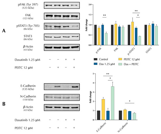 Considering that dasatinib efficacy is limited by FAK activation and that ITCs are known to inhibit FAK, it was hypothesised that FAK plays a central role in the synergistic anticancer activity of PDc. Focal adhesions have a fundamental role in linking the cytoskeleton with the ECM, allowing the cells to migrate and receive external stimuli. Focal adhesions contain multiple components, including FAK, which communicate with structural proteins, such as the cadherin family members. FAK has a role in numerous cellular processes such as proliferation, migration, and invasion. Protein expression analysis using Western blot confirmed that PDc reduced the activation of FAK (Figure 5A). Furthermore, PDc treatment reduced the activation of STAT3, which is involved in the activation of transcription factors for the expression of genes involved in proliferation, migration, invasion, and angiogenesis (Figure 5A). Finally, to confirm the effect of PDc on the migratory capability of HepG2 cells, protein expression analysis showed a marked increase in E-cadherin expression and a slight decrease in N-cadherin Figure 5B).