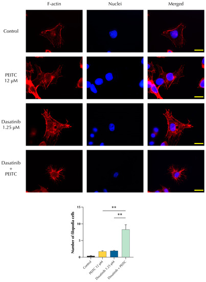 Dasatinib is an approved chemotherapeutic agent that showed strong cytotoxicity towards numerous HCC cell lines, but its potency is limited in vivo by the activation of FAK [7]. One of the major targets of dasatinib is the c-Src tyrosine kinase, which phosphorylates FAK, leading to its activation and thus, the formation of new focal adhesion complexes and the activation of downstream signalling pathways involved in cell survival, proliferation, and migration [24,25]. FAK has been linked to the uncontrolled proliferation and migration of tumour cells and being over-expressed in different types of tumours [26]. In the work of Liu et al. [7], one of the main conclusions was that the combination of dasatinib with FAK inhibitors may improve dasatinib potency in HCC. This was corroborated when dasatinib was shown to synergise with rosuvastatin in HCC, and the combined improved anti-cancer activity was associated with the inhibition of the Src/FAK pathway [10]. ITCs are known to inhibit FAK signalling and PEITC is the most effective FAK inhibitor [27]. In this study, protein expression analysis showed that PDc significantly reduced the phosphorylation of FAK at Tyr-397. This residue binds c-Src, leading to the enzymatic activation that propagates the downstream signal [26,28]. Focal adhesion complexes, induced by c-src and FAK activity, stabilise actin filaments. [29]. Phalloidin staining of cytoskeletal actin filaments shortly after treatment with PDc highlighted that the drug combination leads to shrunk morphology and the formation of numerous filopodia. Filopodia are extended structures with sensory functions that reorganise into lamellipodia, allowing cell adhesion and migration [30]. The increase in filopodia formation has been observed before in breast cancer cells treated with resveratrol [30] where it was accompanied by the inhibition of cell migration, and a reduction in focal adhesion complexes and Tyr-397 FAK phosphorylation. In a different study, FAK was differentially activated in adherent and non-adherent cells and its inactivation led to the loss of cell adhesion and cell death [23]. It can be hypothesised that one of the effects of PDc is the inhibition of focal adhesion complexes that leads to the observed loss of adhesion, resulting in cell death.