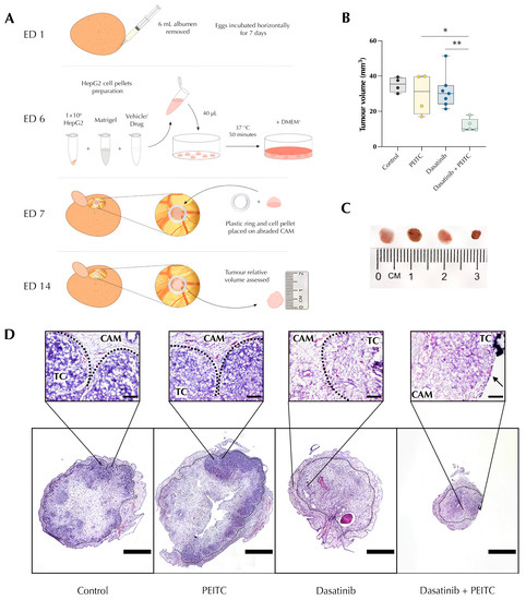 Effect of PDc on HepG2 chorioallantoic membrane (CAM) xenograft. (A) Diagram of HepG2 CAM xenograft method. (B) Quantification of tumour volume in three independent experiments (mean ± SEM, Control n = 4, PEITC n = 4, Dasatinib n = 6, P + D n = 5). The degrees of significance are indicated as * p < 0.05, ** p < 0.01, calculated using one-way ANOVA and Tukey’s post hoc multiple comparison. (C) Representative images of resected HepG2 xenografts (from the left: control, PEITC, dasatinib, PDc). (D) CAM xenograft histology H&E staining. TC = tumour cells, CAM = chorioallantoic membrane, dotted lines separation of tumour cells and CAM. Arrow indicate the edge of the tumour mass that is not surrounded by the CAM. Scale bar = 1 mm.