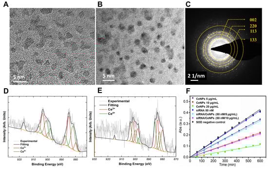 The particle size and morphology of synthesized CeNPs and CTSK siRNA/CeNPs mixture were analyzed using TEM techniques. A particle size of approximately 3 to 5 nm with uniform dispersion was observed for the control CeNP samples (Figure 1A). In contrast, the CTSK siRNA/CeNPs mixture samples showed spherical particles with a pronounced dark contrast in the TEM images. This dark contrast in the TEM images is ascribed to the density of organic CTSK siRNA conjugated to the CeNPs surface [56]. Despite this, individual particles are still observable in the micrograph (Figure 1B); the size of the particles was around 3–6 nm (estimated using ImageJ), similar to pure CeNPs. The corresponding selected area electron diffraction (SAED) pattern for the CTSK siRNA/CeNPs sample, shown in Figure 1C, possesses a ring pattern corresponding to (002), (220), (113), and (133) planes specific to the fluorite structure of cerium oxide. Chemical state analysis was performed for both the control CeNPs and the CTSK siRNA/CeNPs samples according to cerium redox state composition. X-ray photoelectron spectroscopy (XPS) measurements and analysis in the binding energy region characteristic of the Ce3d orbitals are presented in Figure 1D,E. The measurement signal was de-convoluted into multiple peak contributions, with spin–orbit coupling producing Ce3d5/2 and Ce3d3/2 envelopes [57,58]. Fitted peaks are ascribed to varied electronic configurations related to the Ce3+ and Ce4+ states. The fraction of cerium sites measured in reduced form was determined to be ~60% (or Ce3+/Ce4+: 1.5) for both the CeNPs and the CTSK siRNA/CeNPs samples (calculated as the sum of integrated Ce3+ peak signal intensities and normalized to the total sum over all cerium-related peaks). It should be noted that other studies have observed that X-ray irradiation power and vacuum exposure time can influence the degree of cerium reduction. Therefore, we limited the exposure of the test samples to these conditions. Additionally, the measured values are comparable to previous measurements for similar formulations. Interestingly, X-ray absorption studies in the existing literature suggest a near-absence of reduced site cerium in colloidal CeNPs [59,60]. These studies contend that redox occurs at the particle surface through electron occupation in configurations of mixed Ce-O orbital characters [59]. Herein, we consider only the measured value of Ce3+/Ce4+ as a qualitative metric of surface chemistry, given the substantial published literature relating this value with enzyme-mimetic character [61].