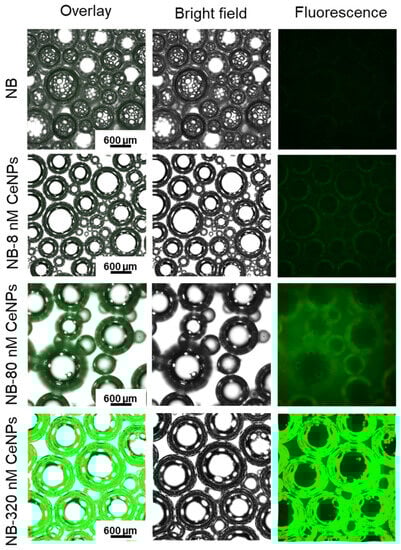 Fluorescent and bright field microscopy of nanobubbles loaded with 0, 8, 80, and 320 nM of FITC-labeled CeNPs after 2 h of LIPUS stimulation for 4 min (1 MHz frequency; 1 W/cm2).