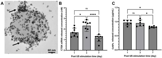 (A) Transmission electron microscopy of nanobubbles loaded with CeNPs (black arrows show CeNPs adsorbed on a nanobubble) and (B,C) release profile of siRNA and CeNPs from 1 mg/mL of US-stimulated NB after 1, 3, and 7 days of incubation at 37 °C. Significant differences were determined using a one-way ANOVA and Tukey’s post hoc test. ns = not significant (p > 0.05). *: p < 0.05; ****: p < 0.0001.