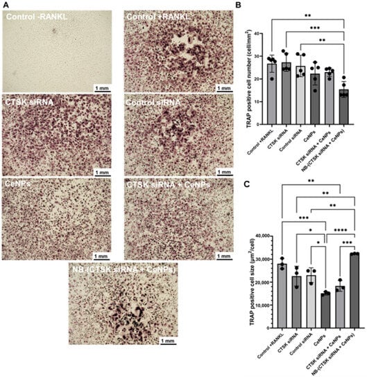 (A) TRAP staining of human osteoclasts precursors cultured with the following samples at day 7: control negative (control −RANKL), control positive (control +RANKL), 2.5 nM CTSK siRNA, 2.5 nM control siRNA, 1 µg/mL CeNPs, 1 µg/mL CeNPs + 2.5 nM CTSK siRNA, NB-(2.5 nM CTSK siRNA + 1 µg/mL CeNPs). All of the groups that contained CTSK siRNA and control siRNA were treated with a 1 vol.% transfection reagent. Quantification of TRAP-positive osteoclasts: (B) TRAP-positive cell number and (C) TRAP-positive cell size. Significant differences were determined using a one-way ANOVA and Tukey’s post hoc test. *: p < 0.05, **: p < 0.01, ***: p < 0.001, ****: p < 0.0001.