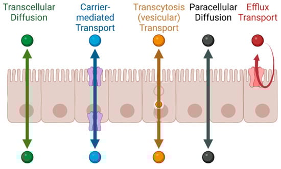 Permeability can be defined simply as how easily a molecule crosses a biological membrane. It is expressed as the velocity—distance per unit time (e.g., in units of cm/s)—at which the molecule crosses the membrane, irrespective of whether its transport mechanism is active or passive [12]. For all molecular types described above, the relevant permeability for oral administration is across enterocyte plasma membranes or between the cells [13]. In transcellular absorption, the drug encounters the gut enterocytes and must cross into the interstitial fluid at the basolateral side of the cells to be absorbed, after which stage it eventually enters the blood stream. As described in Figure 1, permeability across a cellular barrier can occur through the cells (transcellular), during which transport can occur via transcellular diffusion; through transporter proteins (active or facilitated); either on both sides of the cell or only one side; or through cellular vesicles (transcytosis) [14]; alternatively, permeability can refer to movement between the cells (paracellular diffusion). Efflux transport, in contrast to the above-mentioned mechanisms, is a directed, protein-mediated transport out of the cell [15,16,17,18]. While transcellular diffusion, paracellular diffusion and facilitated transport are passive and follow the electrochemical gradient across the cells from the sites of higher to lower electrochemical potential, active and efflux transport can occur against the electrochemical gradient. Thus, both active uptake and efflux transport are critical components of drug ADME [19,20]. Transcytosis is mostly relevant for larger cargo, including drugs like antibodies or antibody–drug conjugates, and occurs through endosomal vesicles.
