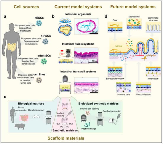 Designing human tissue-based in vitro models of the gut. (a) Potential cell sources used for the generation of tissue-based in vitro models. Prior to use as cells for intestinal modeling, hESCs and hiPSCs require differentiation towards the intestinal lineage, while SCs require a final differentiation to produce the individual intestinal cell types. (b) Schematics of currently applied culture systems i.e., intestinal organoids, fluidic and transwell-like systems; corresponding histological cross-sections of intestinal cell layer (Alzian blue [upper and lower picture] and H&E [center picture] stainings) are shown. (c) Summary of most commonly used scaffold materials in tissue engineering, including decellularized gut segments and synthetic matrices either coated with biomolecules, e.g., laminins or biofunctionalized with peptides or relevant niche cells. (d) Overview of important factors that need to be considered in future for designing even more physiologically relevant small intestinal in vitro models. Relevant components are (1) the extracellular matrix scaffolds used to stimulate ECM-regulated cell functions; (2) flow used to apply mechanical stimuli and induce mechanoresponsive signals; (3) microbiome used to consider the diverse microbial effects, such as bacterial metabolites; (4) immune cells used to enable epithelial–immune cell crosstalk, especially in terms of pathogen invasion; (5) perfusable vascular structures used to allow the efficient transport of gases, nutrients and metabolic products; (6) a biomimetic structure used to establish local tissue niches, such as the stem cell crypt; and (7) innervating structures used to reproduce neural signals regulating intestinal functions.