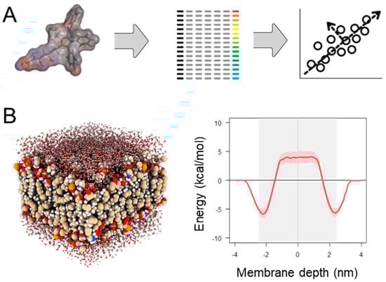 Computational methods used to estimate and rationalize membrane permeability to drug molecules. (A) In machine learning-based modeling of structure–permeability relationships, measured permeability values are related to a numerical description of molecular structure and properties using a machine learning algorithm. This process yields a mathematical model that can be used to predict permeability for new molecules, given that they are similar enough to molecules used in model training (‘within the applicability domain of the model’). (B) Molecular dynamics simulation describes movement and interactions of atoms in a system of molecules and can be used to derive energy landscapes for penetration of permeating molecules into a simulated cell membrane.