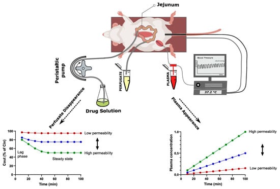 Intraintestinal dosing of drug solutions (or formulations) directly into the intestinal lumen of suitable animal species can be used to determine permeability based on plasma drug appearance (Figure 6), using the same permeability calculation method as that described in Equation (2) [142].