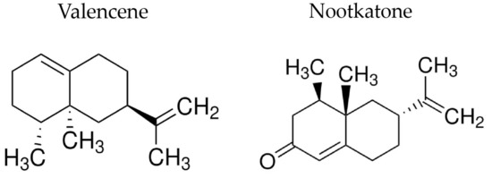 - Elston, A.; Lin, J.; Rouseff, R. Determination of the Role of Valencene in Orange Oil as a Direct Contributor to Aroma Quality. Flavour Fragr. J. 2005, 20, 381–386. [Google Scholar] [CrossRef]