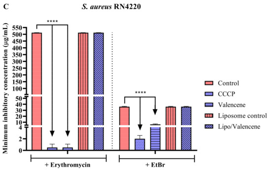 Oliveira-Tintino CDdM, Santana JEG, Alencar GG, Siqueira GM, Gonçalves SA, Tintino SR, Menezes IRAd, Rodrigues JPV, Gonçalves VBP, Nicolete R, et al. Valencene, Nootkatone and Their Liposomal Nanoformulations as Potential Inhibitors of NorA, Tet(K), MsrA, and MepA Efflux Pumps in Staphylococcus aureus Strains. Pharmaceutics. 2023; 15(10):2400. https://doi.org/10.3390/pharmaceutics15102400