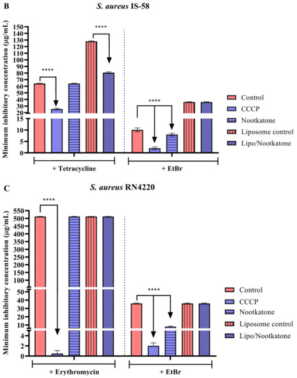 Oliveira-Tintino, C.D.d.M.; Santana, J.E.G.; Alencar, G.G.; Siqueira, G.M.; Gonçalves, S.A.; Tintino, S.R.; Menezes, I.R.A.d.; Rodrigues, J.P.V.; Gonçalves, V.B.P.; Nicolete, R.; et al. Valencene, Nootkatone and Their Liposomal Nanoformulations as Potential Inhibitors of NorA, Tet(K), MsrA, and MepA Efflux Pumps in Staphylococcus aureus Strains. Pharmaceutics 2023, 15, 2400. https://doi.org/10.3390/pharmaceutics15102400