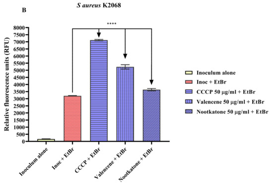 - Patel, D.; Kosmidis, C.; Seo, S.M.; Kaatz, G.W. Ethidium Bromide MIC Screening for Enhanced Efflux Pump Gene Expression or Efflux Activity in Staphylococcus aureus. Antimicrob. Agents Chemother. 2010, 54, 5070–5073. [Google Scholar] [CrossRef] [PubMed]