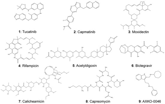 We then searched PubChem (https://pubchem.ncbi.nlm.nih.gov/ (accessed on 6 February 2023)) for information about these compounds and published bioassay data. Compounds 1 (tucatinib) and 2 (capmatinib) are orally bioavailable drugs for treating specific cancer types. In detail, tucatinib is an inhibitor of the human epidermal growth factor receptor tyrosine kinase ErbB-2 (also called HER2) used in combination with other medications (i.e., trastuzumab and capecitabine) to treat unresectable or metastatic HER-2-positive breast cancer. Capmatinib is an inhibitor of the proto-oncogene c-Met (or hepatocyte growth factor receptor/HGFR) commonly used to treat non-small metastatic-cell lung cancer. On the other hand, moxidectin (compound 3) is a macrocyclic lactone derived from Streptomyces cyanogriseus that exhibits antiparasitic activity. Rifampicin (compound 4) is an ansamycin antibiotic used to treat various bacterial infections. Acetyldigoxin (compound 5) is a natural compound found in the plant Digitalis lanata and used to treat congestive heart failure. Bictegravir (compound 6) is a second-generation human immunodeficiency virus (HIV) integrase inhibitor and was excluded from further evaluation due to its low binding affinity. Unfortunately, no information is available in the PubChem database for compound 7 (calicheamicin). Despite this, according to Pubchem, calicheamicin has been linked to the onset of genetic diseases, which has led to its exclusion from further evaluation. Finally, capreomycin (compound 8) is an injectable, broad-spectrum antibiotic used in combination with other antituberculosis drugs as a second-line treatment for drug-resistant tuberculosis. Furthermore, compound 8 was deemed not worth further study due to its high molecular mass (Lipinski rules violation). The inhibitory potential of the remaining five compounds was investigated further using in vitro assays, as discussed in the following paragraphs. Importantly, we wanted to further evaluate the potential of compounds 1 and 2 as dual inhibitors of enzymes that have been implicated in the development of specific cancer types, such as breast and lung cancer.