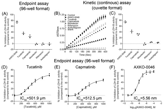 Screening of candidate inhibitors of LDH-B. (A) Effect of the five best candidates from virtual screening and positive control (AXKO-0046) on LDH-B activity. The inhibitory effect of the compounds was assessed in a 96-well format end-point colorimetric assay, as described in the text. (B,C)The effect of the five potential inhibitors and AXKO-0046 on LDH-B activity was also subsequently evaluated using a kinetic (continuous) colorimetric assay in a cuvette format, as described in the text. The changes in the absorbance at 570 nm (due to the formation of the formazan derivative) were monitored in the absence and presence of the inhibitors for 420 s (B). The continuous assay also confirmed that tucatinib and capmatinib inhibit LDH-B activity (C). Dose-dependent inhibitory effect of tucatinib (D), capmatinib (E), and AXKO-0046 (F) on LDH-B activity. In all (A,C–F), the % inhibitory effect of the candidate inhibitors was assessed by comparing LDH-B activity in the presence of each compound with that of a control (without any of the inhibitors). The results are presented as mean values ± S.D (n = 3).