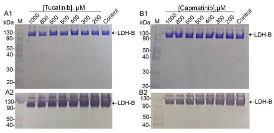 Effect of tucatinib and capmatinib on tetramer formation and activity of LDH-B. Equal amounts of LDH-B (5 ng) were incubated with increasing concentrations of either tucatinib (A1,A2) or capmatinib (B1,B2) for 30 min, followed by loading onto 10% native (non-reducing) polyacrylamide gels. After electrophoresis, gels were stained with Coomassie Brilliant Blue to assess the effect of both compounds on LDH-B tetramer formation (top panels). As shown, neither compound affected the integrity of the tetramer. A second set of gels underwent zymogram analysis, as described in the text, to assess the effect of the potential inhibitors on enzyme activity (bottom panels). LDH-B activity decreased with increasing concentrations of both compounds.