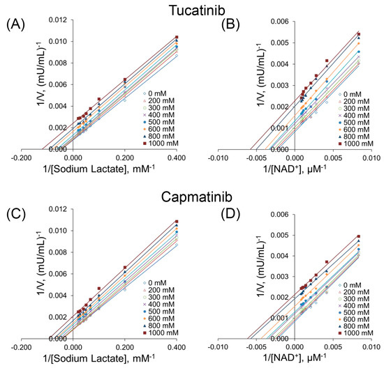 We performed substrate competition assays to elucidate the mechanism by which both compounds inhibit the activity of LDH-B. We evaluated the LDH-B inhibitory activity of tucatinib and capmatinib at various concentrations of lactate and NAD+. The classic Μichaelis–Menten analysis also revealed that both compounds might inhibit LDH-B via the uncompetitive mechanism of inhibition. In detail, the Km and Vmax values for LDH-B were determined in the presence of increasing concentrations of the two candidate inhibitors (Table 2). As the concentration of both compounds increased, the Vmax and Km decreased (Table 2). At the same time, the Lineweaver plot lines were almost parallel (Figure 4), indicating uncompetitive inhibition, i.e., the inhibitors bind to the enzyme–substrate complex.