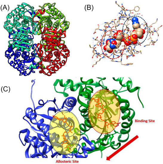 We performed molecular dynamics studies to further evaluate the inhibitory effects of tucatinib and capmatinib and gather more information about their mechanisms of action (Figure 5). The 3D structure of the LDH-B tetramer is illustrated in Figure 5A. The catalytic site of LDH-B consists of His193, which acts as a proton acceptor during the catalytic reaction; Arg106, which stabilizes the substrate in the active site; Arg169, which forms a salt bridge with Arg106 and helps to stabilize the enzyme–substrate complex; and Lys102, which facilitates the binding of the coenzyme NAD+. Our analysis revealed that both compounds bind to the allosteric site, which is distant from the catalytic site (Figure 5B,C).