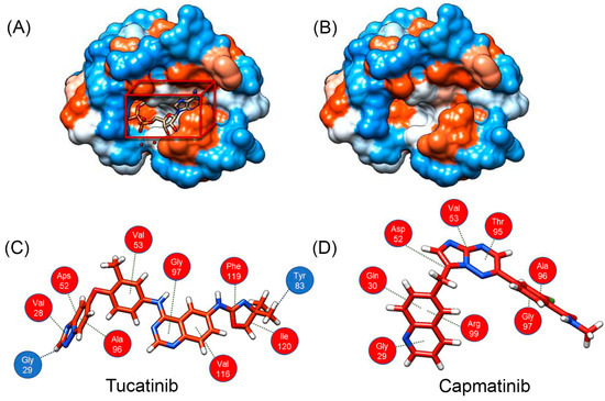 LDH-B contains an allosteric binding site, which is probably formed after the binding of lactate and NAD+. The allosteric binding site of LDH-B with (A) and without (B) tucatinib is shown. Tucatinib (C) interacts with hydrogen bonds and hydrophobic interactions with the amino acids of the active site, while capmatinib (D) only via hydrophobic interactions. The amino acids forming hydrogen bonds with tucatinib are highlighted in blue, while the amino acids interacting with both inhibitors through hydrophobic interactions are highlighted in red.