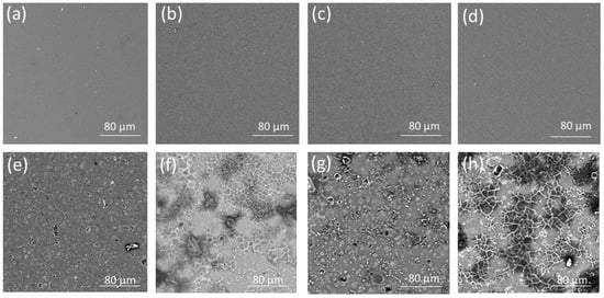 Surface representative images of non-crosslinked formulation placebos: (a) formulation P1, (b) formulation P4; crosslinked formulation placebos: (c) formulation P2 and (d) formulation P5; non-crosslinked POS-loaded formulations: (e) formulation F1 and (f) formulation F4; and crosslinked POS-loaded formulations: (g) formulation F2 and (h) formulation F5, under magnification ×1000.