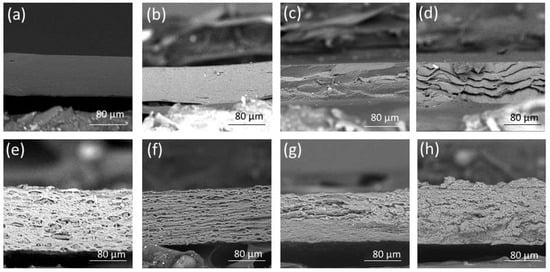 To assess the morphology of the prepared films, a scanning electron microscope (SEM) Phenom Pro G5 (Phenom World, Eindhoven, The Netherlands) was applied. Non-coated and sputter-coated with a 2 nm thick layer of gold film samples were imaged using an in-line detection mode at 5–10 kV with an 8 mm work distance and backscattered (BSD) detector.
