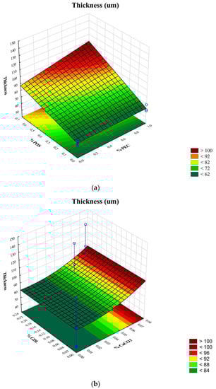 Three-dimensional (3D) response surface diagrams of (a) thickness versus PEC existence and POS concentrations and (b) thickness versus CaCO3 and GDL concentrations.