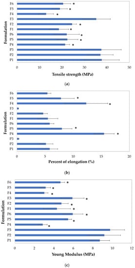 Moisture content is one of the crucial properties of films that significantly affects disintegration time. Preis et al. demonstrated that films characterized by high values of moisture content tend to disintegrate faster than films with a lower moisture content [16]. Water presence in the formulation is also relevant for flexibility closely associated with packaging possibility and application comfort. In turn, the high moisture content of the films can facilitate the growth of microorganisms and lead to recrystallization of the drug substance. In all designed film formulations, moisture presence, expressed as percentage values, obtained values from 4.11 ± 0.85% to 5.71 ± 1.20% (Table 3). The obtained values are within the range according to Borges et al., who reported that the moisture content in oral film should be in the range of 3–6% [24]. Weight uniformity is a key parameter, which determines the accuracy of the drug dosage. The obtained results show that the weights of the prepared films were in the range from 38.28 ± 3.43 for P1 to 57.88 ± 3.62 for F3. In general, the weight of the films increased with the presence of crosslinking factors and POS. The PEC addition insignificantly affected the change in the weight of films. Film thickness is an indicator that significantly affects the mechanical properties, disintegration time, swelling properties and drug release. The thicknesses found ranged from 57.67 ± 5.19 μm in P1 to 68.17 ± 5.42 in P6 and from 83.06 ± 9.31 in F1 to 139.22 ± 3.72 μm in F6 (Table 3). According to the three-dimensional response surface graph, it was shown that PEC and POS presence increased films thickness (Figure 5a). Additionally, it was expressed that crosslinked films were characterized by a significantly higher thickness (p < 0.05) (Figure 5b). Similar data for the increasing thicknesses of ALG/PEC films crosslinked with zinc ions prepared by the external gelation method were noted by Nešić et al. [25]. It was shown that the values of films thickness were significantly (p < 0.05) enhanced with POS presence and in the case of crosslinked formulation. However, the presence of PEC significantly (p < 0.05) changed the thickness of the films (Table 3).