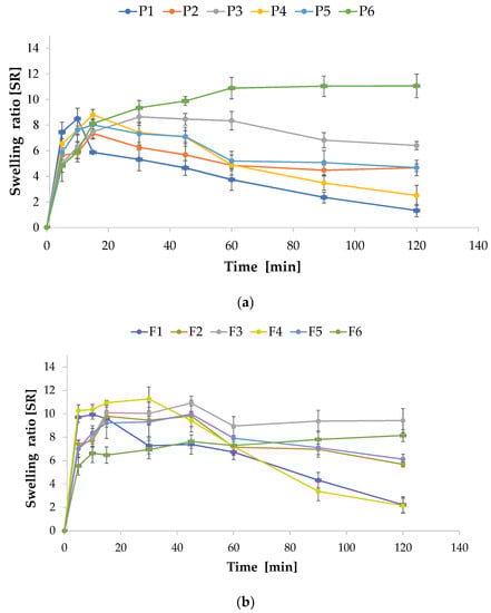 The swelling properties of the prepared films were presented as a swelling ratio (SR) determined using SSS (pH = 6.8). Accurately weighted films in the baskets (accessories from USP dissolution equipment) were situated in the beakers containing 15 mL SSS. Studies were conducted at the temperature of 37 ± 1 °C and at different time periods (5, 10, 15, 30, 45, 60, 90 and 120 min). After a certain time, the baskets were taken out of the beakers and cautiously strained. Furthermore, baskets containing films were weighted. The obtained data were applied to calculate the swelling ratio (SR) using the equation: