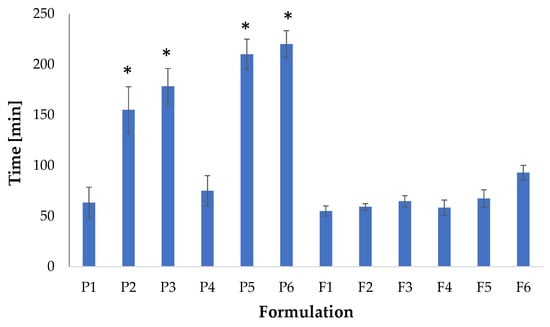 Disintegration time affects drug release, which is intensely related to the medium volume. Therefore, in this study, disintegration time was determined in the pharmacopoeial apparatus with 700 mL SSS and using a Petri dish containing 7 mL of the medium in order to simulate saliva capacity inside the human oral cavity (Table 4). It was observed that PEC and POS presence in the formulation had an effect on the extension of the disintegration time. It was reported that the time of the film’s disintegration increased with the increasing crosslinking agent’s concentration and with the reduced volume of the medium. The test conducted in the Petri dish expressed that the disintegration time was sustained, which is a desirable attribute for buccal administration [27].