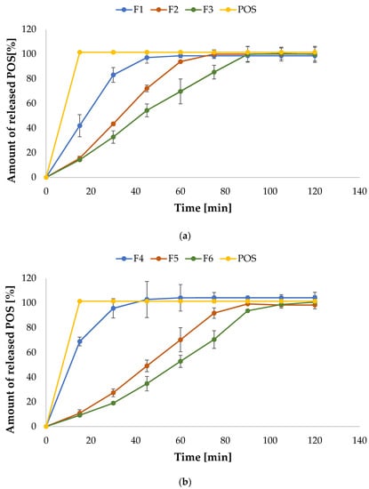 As pH values deviating from physiological values might irritate the buccal mucosa, an important part of the study was to evaluate the pH values of the prepared hydrogels. The results obtained were within the optimal range, indicating compatibility with physiological buccal pH [17]. The pH measurement of obtained hydrogels indicated that both the presence of PEC in the formulation and the presence of crosslinking agents decreased the initial pH values. In addition, formulations containing POS showed slightly higher pH values than the corresponding placebo formulations. The values of surface pH ranged between 6.87 ± 0.02 and 6.87 ± 0.01 for formulations F5 and F6, respectively, and 6.94 ± 0.02 for formulation P1. The noted pH values were approximated to the pH of buccal mucosa (6.28) and prepared films were recognized as being appropriate for buccal administration [26] without a negative impact on the oral mucosa (Table 3). An important parameter of film quality is the evaluation of drug content uniformity, which according to the pharmacopoeial requirements should be in the range from 85% to 115% [13]. It was noticed that the presence of POS in all of the prepared formulations was in the range from 94.72 ± 4.01% to 106.39 ± 6.05%. The obtained results fulfilled the pharmacopoeial requirements and expressed that the experimental parameters did not affect the drug content uniformity (Table 3). Additionally, the received data expressed no significant disparities in POS content within a particular formulation (p > 0.05). This fact demonstrated that the presented technique was characterized by reproducibility and allows uniform distribution of the active substance in the films.