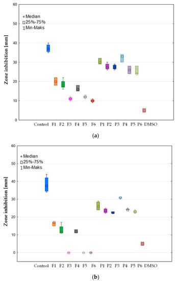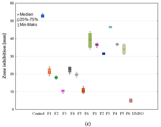 Antifungal action of the prepared films was performed according to the Clinical and Laboratory Standards Institute (CLSI), and the plate diffusion technique was applied [20]. The initial density of Candida cells: Candida albicans ATCC® 10231, Candida krusei ATCC® 6528 and Candida parapsilosis ATCC® 22019 was around 2–5 × 106 colony forming units (CFU/mL). In the next step, the fungi inoculum in the sterile 0.9% NaCl solution was performed with the final density 0.5 in McFarland (5 × 104 CFU/mL). The optical density of the inoculum was measured by using the suspension turbidity detector (Densitometer DEN-1B, Biosan, Riga, Latvia). A total of 50 µL of the Candida inoculum was placed on the Petri dishes with Sabouraud dextrose agar and rested for 15 min. In the next step, rings (with 5 mm diameter) of all film formulations were inserted on the surface of the plates. The POS, dissolved in DMSO, was used as the control. In this regard, 50 μL of solution of POS in DMSO (containing 1 mg of POS) was situated in a well in the agar basis with a 5 mm diameter. Samples were incubated for 24 and 48 h at a temperature of 37 ± 0.1 °C. Afterwards, the inhibition zones (mm) were labelled with a caliper (Mitutoyo, Kawasaki, Japan).