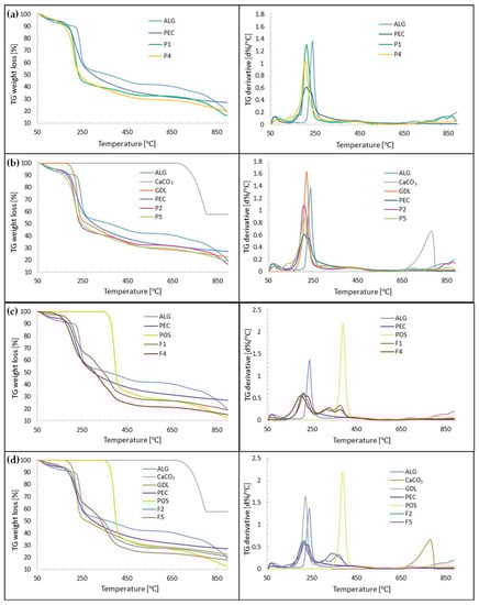 The DSC thermogram of GDL presented an endothermic peak at 169.28 °C, which is related with the melting point. In addition, GDL possessed an endothermic peak at 309.93 °C, which demonstrated its decomposition. The DSC of the CaCO3 curve depicts a straight line because its melting point is at about 825 °C [72]. At 169.52 °C, a sharp endothermic peak was noted, which indicated the melting point of unprocessed POS. Similar detail was expressed by Hens et al. [73]. The received data demonstrate that the POS crystalline character was maintained. The decomposition of POS, during one stage, was indicated at a temperature ranging from 370.45 °C to 431.26 °C, with the maximum at 399.09 °C.