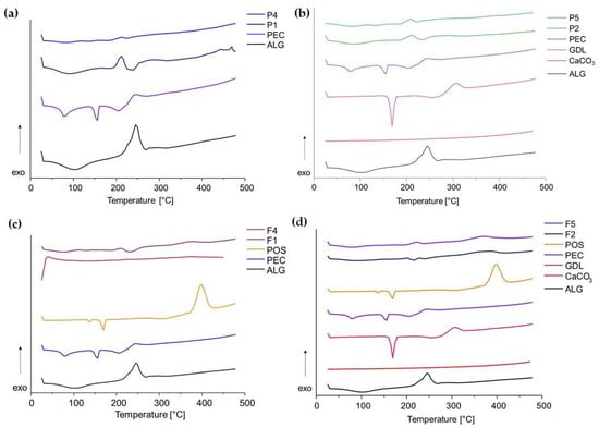 Thermal analysis was carried out applying thermogravimetric analyses (TGA) and differential scanning calorimetry analyses (DSC). Tests of the unprocessed substances: ALG, PEC, POS, CaCO3, GDL, film formulations without drug (P1, P2, P4, P5) and film formulations with POS (F1, F2, F4, F5) were evaluated by a Mettler Toledo Star TGA/DSC unit. To carry out the research performed by TGA and DSC, 3–5 mg weighted samples were deployed in aluminum oxide crucibles. Samples were heated in temperatures ranging from 25 °C to 480 °C with the speed at 10 °C/min under an argon flow and then cooled to 25 °C at a rate of −20 °C/min. One heating/cooling cycle under an argon flow rate of 200 mL/min was performed. As a reference, a blank pan was applied.